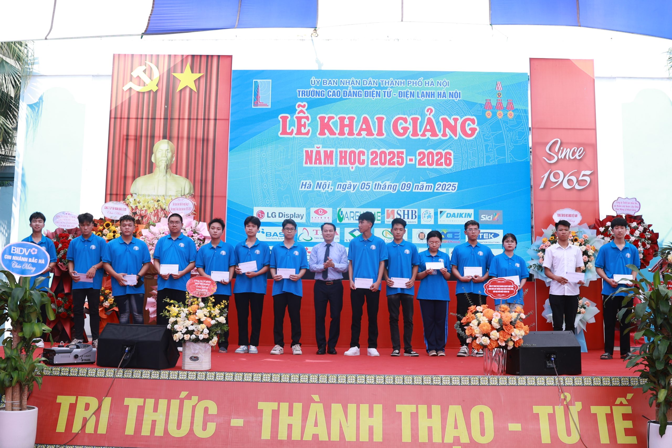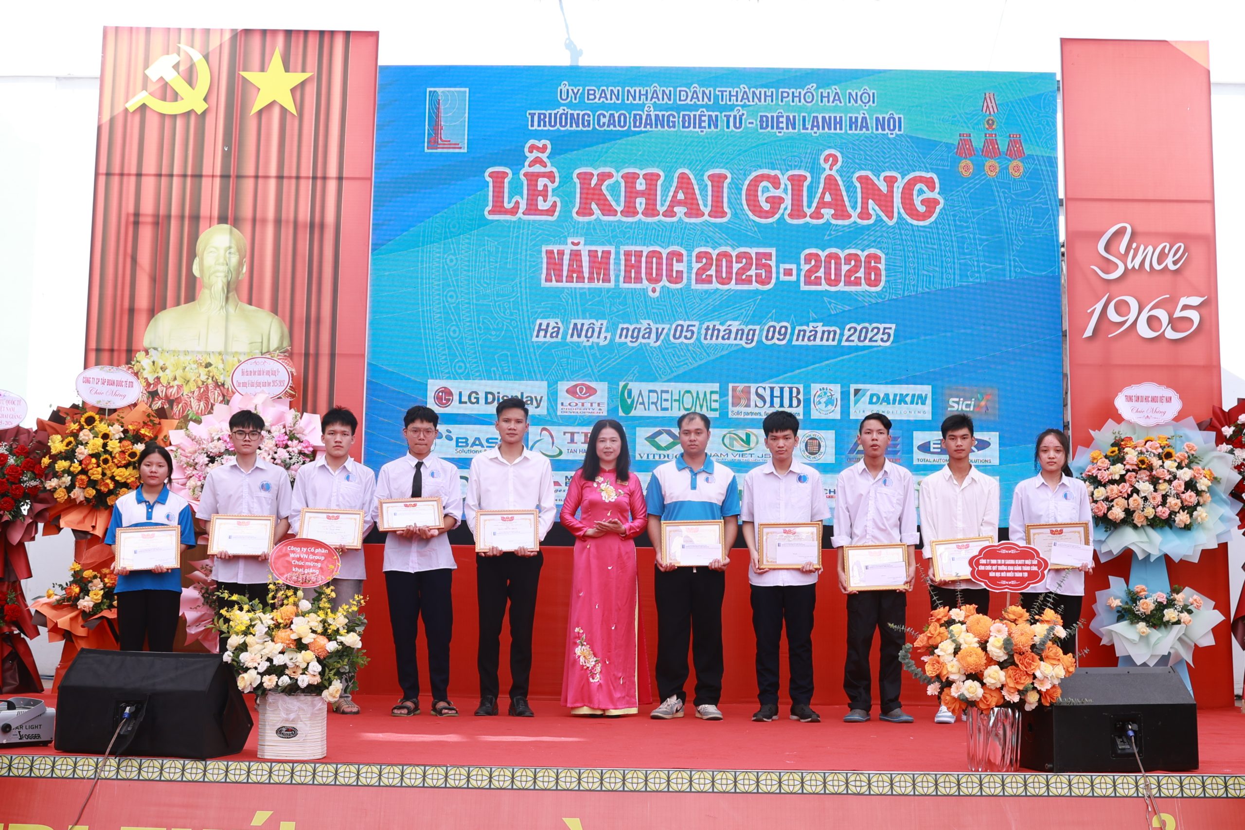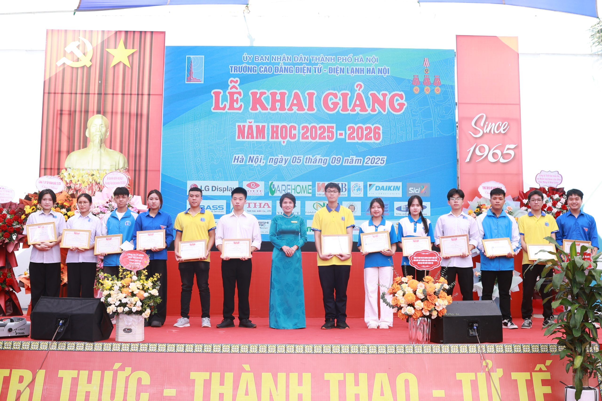Em Công Ngọc Anh – sinh viên K52 ngành KTML&ĐHKK, một trong những sinh viên “lớn tuổi” nhất khóa 52, sau khi đã có trong tay những tấm bằng cử nhân tại các trường khác, nhưng để hỗ trợ cho công việc hiện tại, em vẫn quyết định đăng ký học tại Trường Cao đẳng Điện tử – Điện lạnh Hà Nội. Phát biểu tại buổi lễ, đại diện cho gần 2.000 HSSV toàn trường, em bày tỏ quyết tâm học tập trước thềm năm học mới: “Với em, được trở thành sinh viên của Trường ở tuổi này là một cơ hội đặc biệt, là minh chứng rằng việc học chưa bao giờ có giới hạn. Em tin rằng, cùng với các em học sinh, sinh viên trẻ trung, nhiệt huyết, chúng em sẽ tiếp bước truyền thống 60 năm vẻ vang của Nhà trường, không ngừng học hỏi, sáng tạo, để mỗi ngày đến lớp đều là một ngày ý nghĩa. Ngày hôm này, em vô cùng vinh dự khi được tham dự Lễ khai giảng trang trọng này. Lễ khai giảng ngày hôm nay càng trở nên ý nghĩa khi năm học 2025–2026 gắn với ba sự kiện trọng đại: 80 năm ngày Quốc khánh nước Cộng hòa Xã hội Chủ nghĩa Việt Nam, 80 năm ngày truyền thống ngành Giáo dục, và đặc biệt là kỷ niệm 60 năm thành lập Trường Cao đẳng Điện tử – Điện lạnh Hà Nội”.